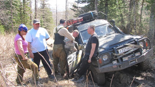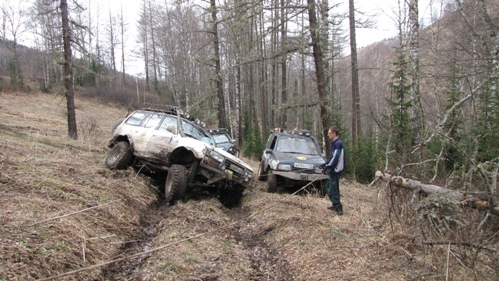 Дорога продолжает преподносить нам сюрпризы.После штурма крутых подъёмов она оказывается еще и размытой,приходиться ехать по косогору и отвешивать машины(очьково скажу я Вам).